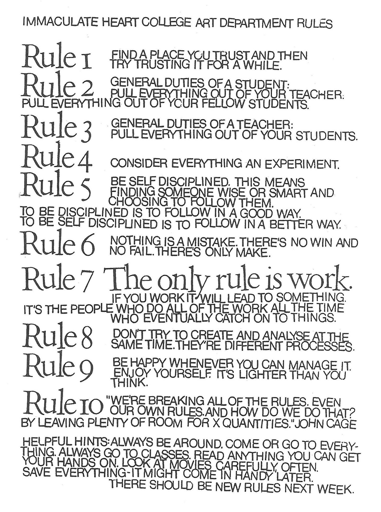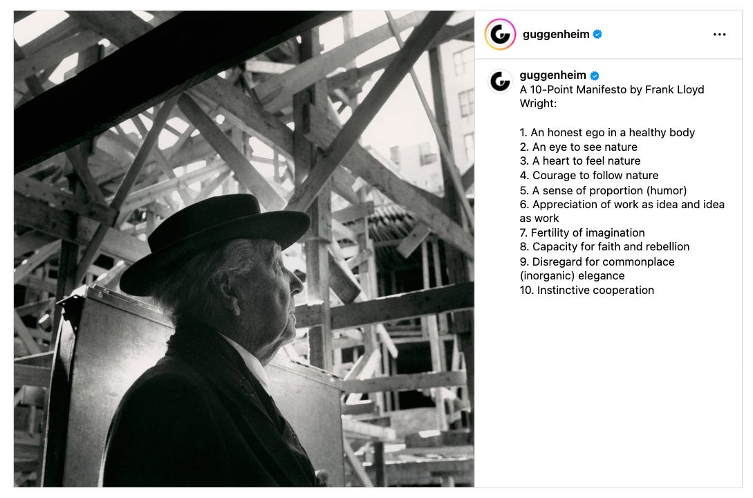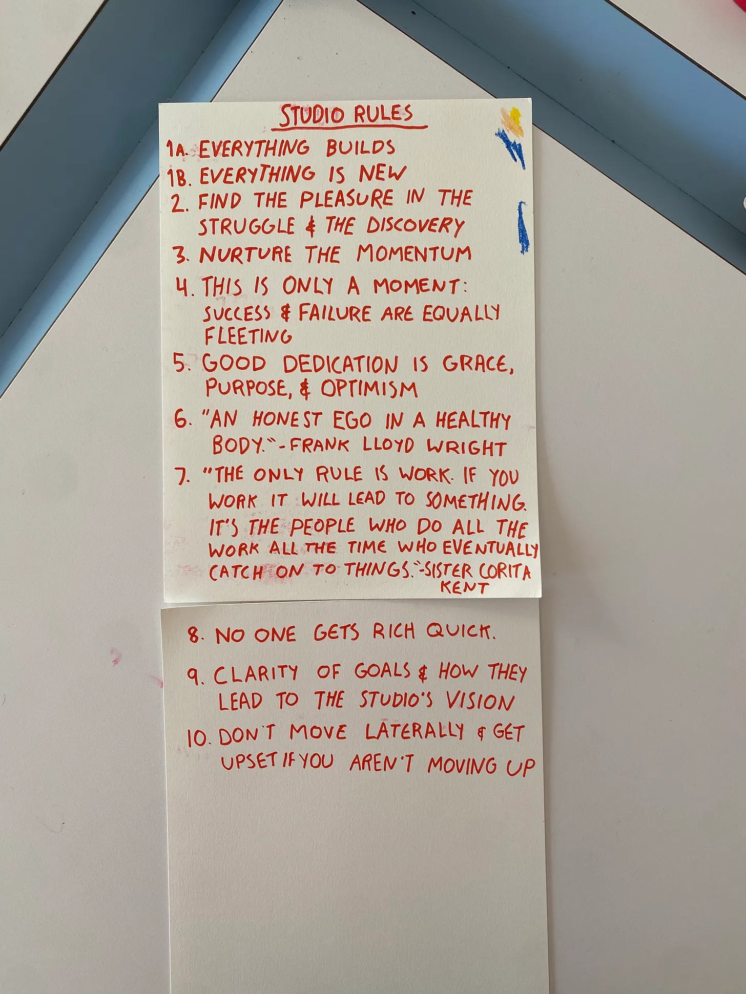 In it, Marble shared Sister Corita Kent’s, the head of Immaculate Heart College’s, rules for her art department, Frank Lloyd Wright’s 10-point manifesto, and, finally, his own. All three are thoughtful, personal, and clear. And it’s not that they even feel like rules. They’re not a prison. Rules might not even be the best term. I like guiding lights.